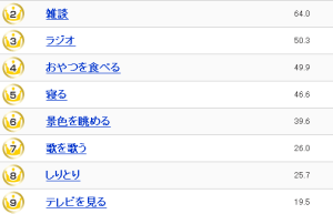 gooランキング。1位は音楽鑑賞、2位雑談、以下20位まで続く。